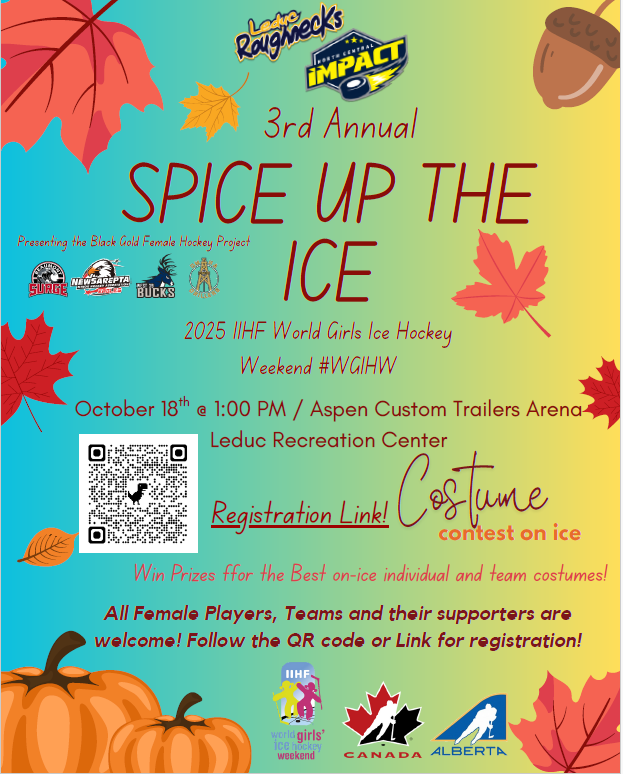 Event Information: A FREE fall-themed event for all our female players and supporters featuring an on-ice session full of costumes, games, and prizes, followed by an afternoon of snacks and warm drinks! The three-hour event includes 90 minutes on the ice with fun hockey-inspired activities and a costume contest, with prizes for the best team and individual costumes. After skating, participants can relax with coffee, hot chocolate, and fall-themed treats while enjoying time together off the ice.